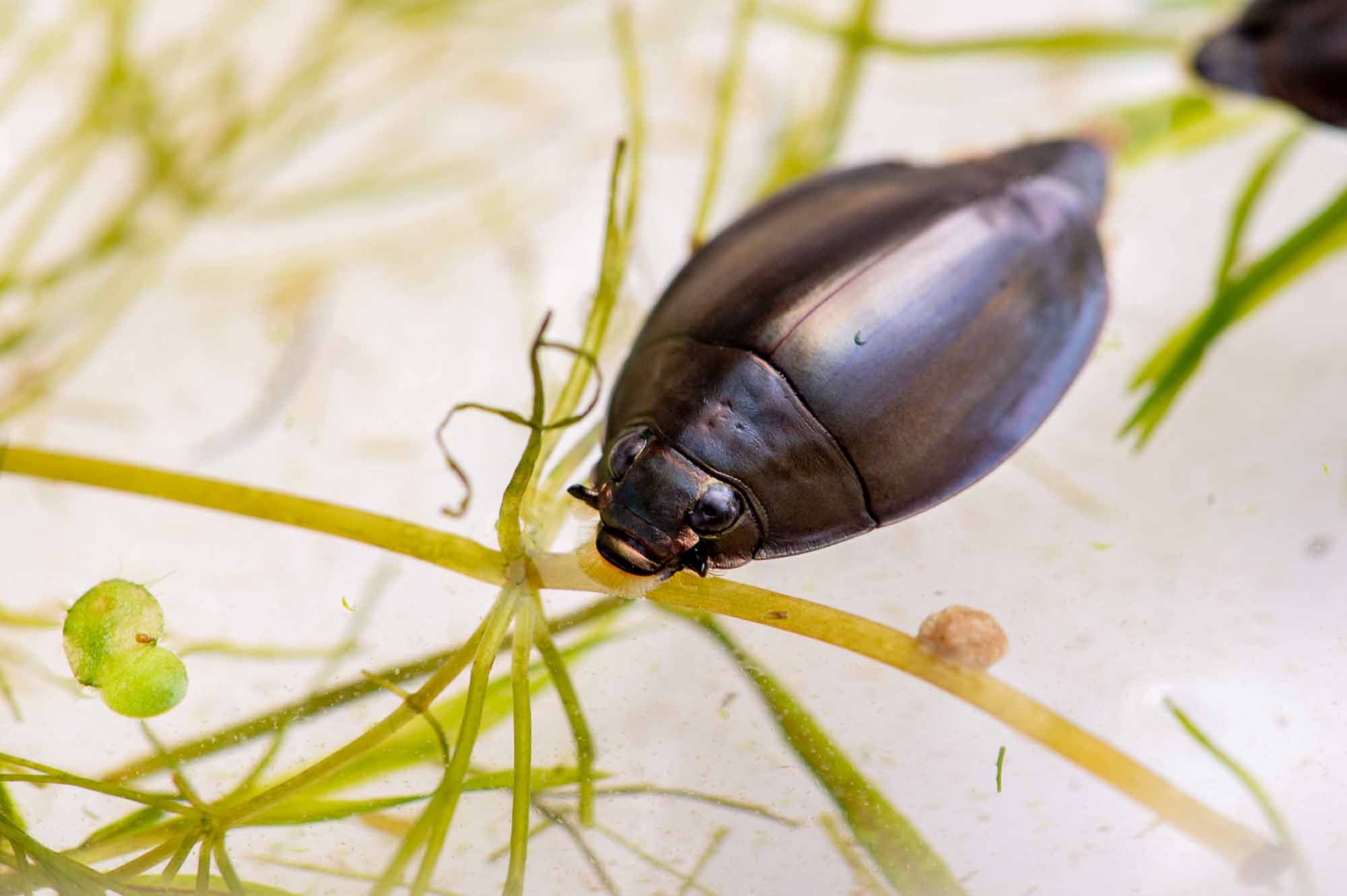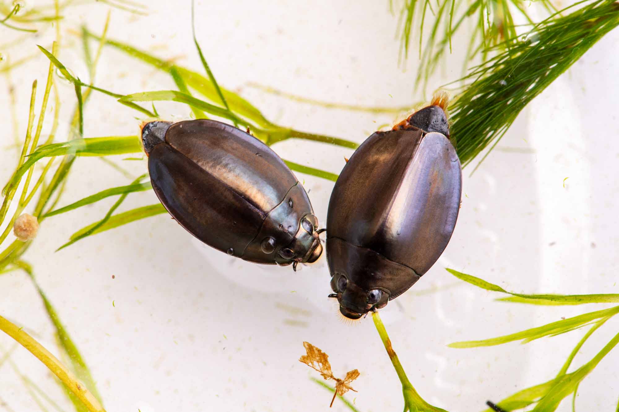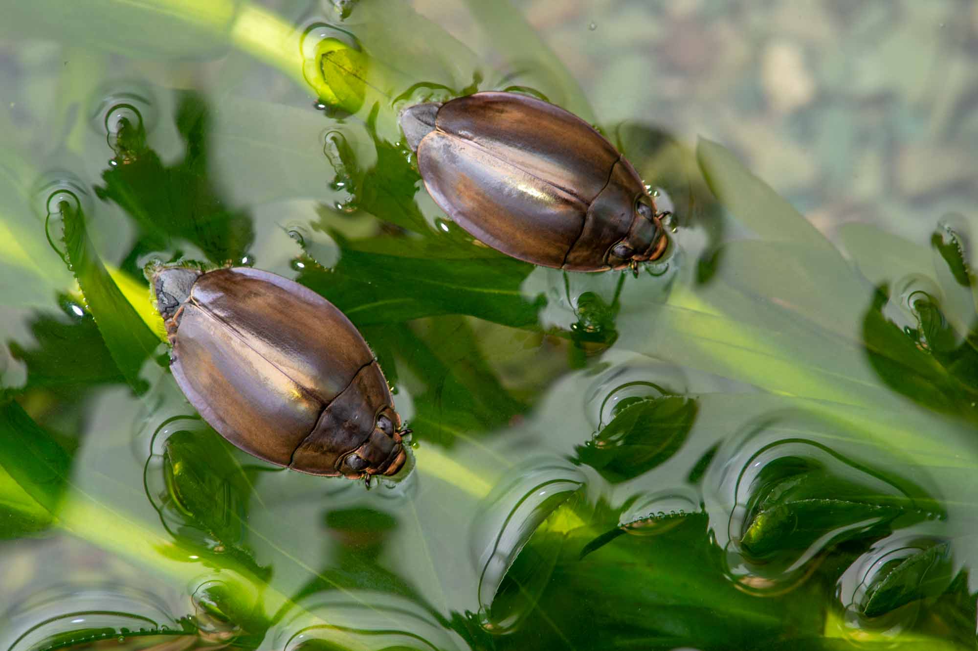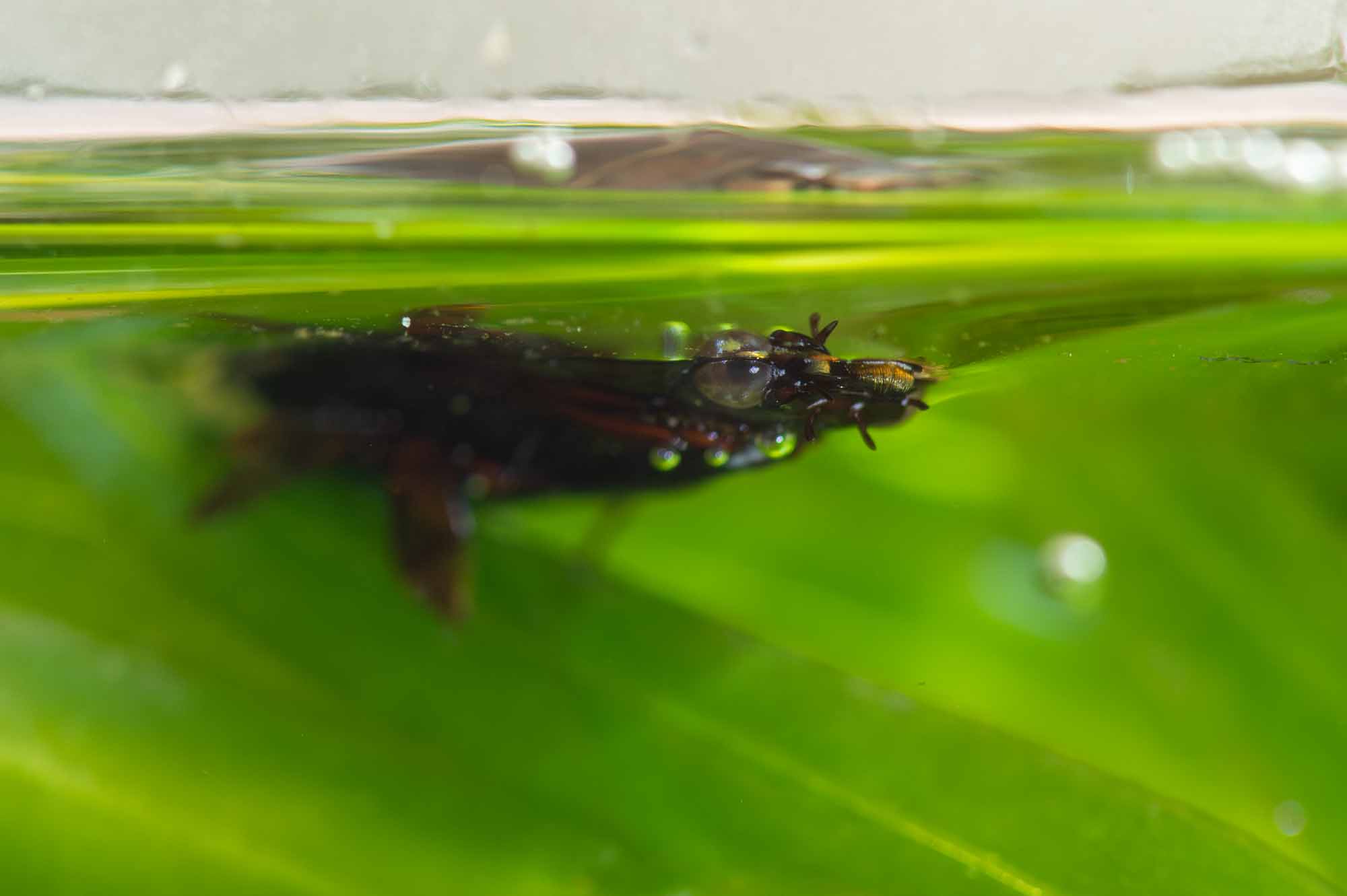 ミズスマシの仲間は、水上と水中のどちらも見ることができるように、複眼が上下に分かれて目が4つあるような特徴を持っています。