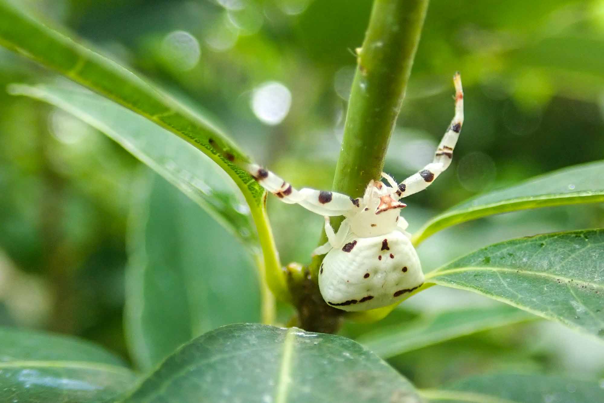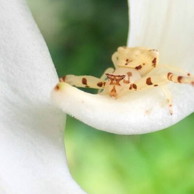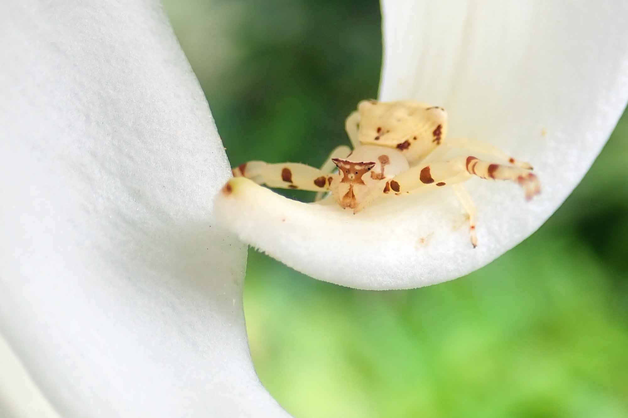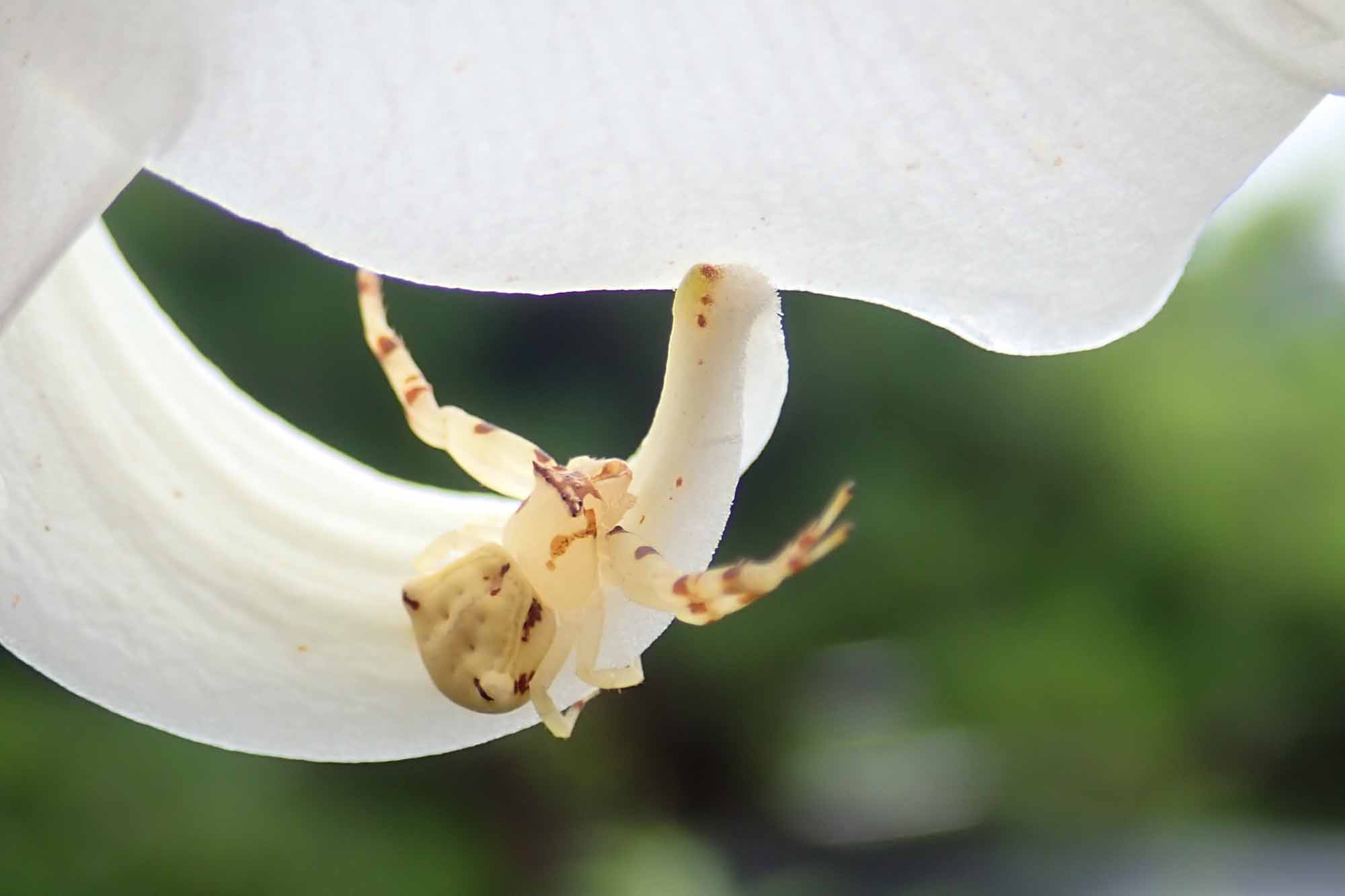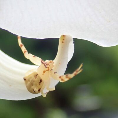 白い体が特徴的なクモの仲間で、巣は作らずに花にとまって獲物がやってくるのを待ちぶせします。