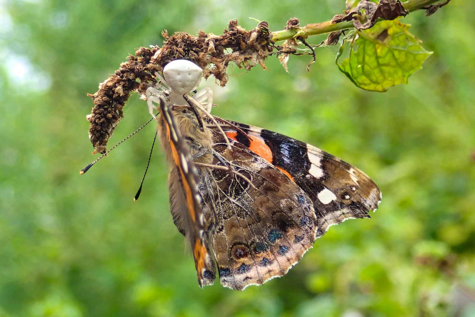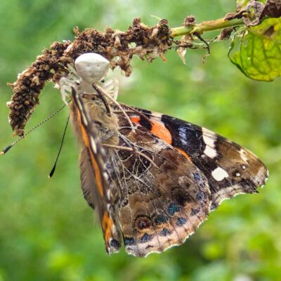 ヒメアカタテハを捕食した白色のアズチグモ