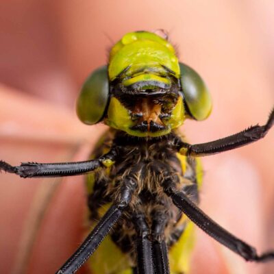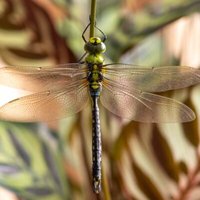 ギンヤンマとは同じくらいか一回り大きいくらいの印象で、名前の由来にもなった胸部の黒筋模様が特徴的です。