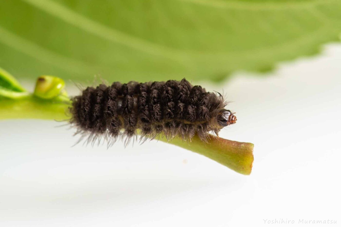 モップのような束感のある毛が特徴的な黒い幼虫です。