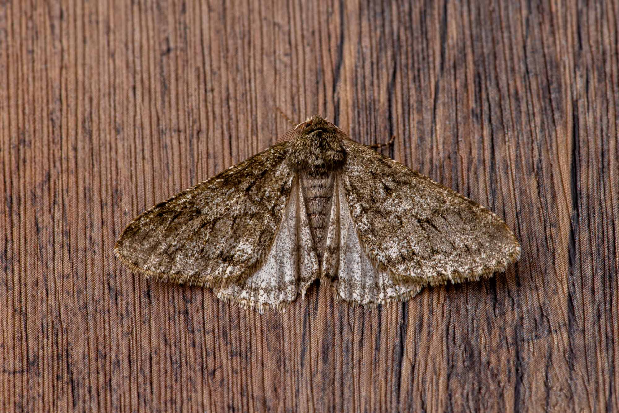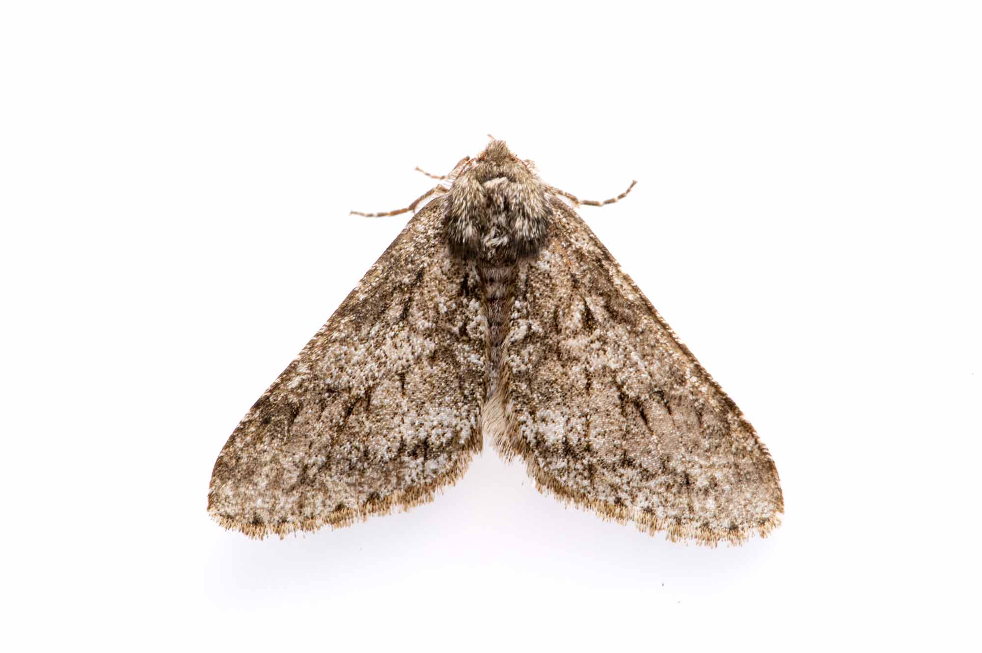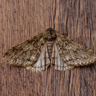 フユシャクの仲間の中では大きめで、三角形に近い形で羽を閉じる。