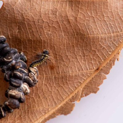 孵化(ふか)したばかりは、黒色の毛虫型イモムシですが、成長するにつれ見た目が大きく変わり、最後には緑色の肉感あるイモムシへと成長していきます。